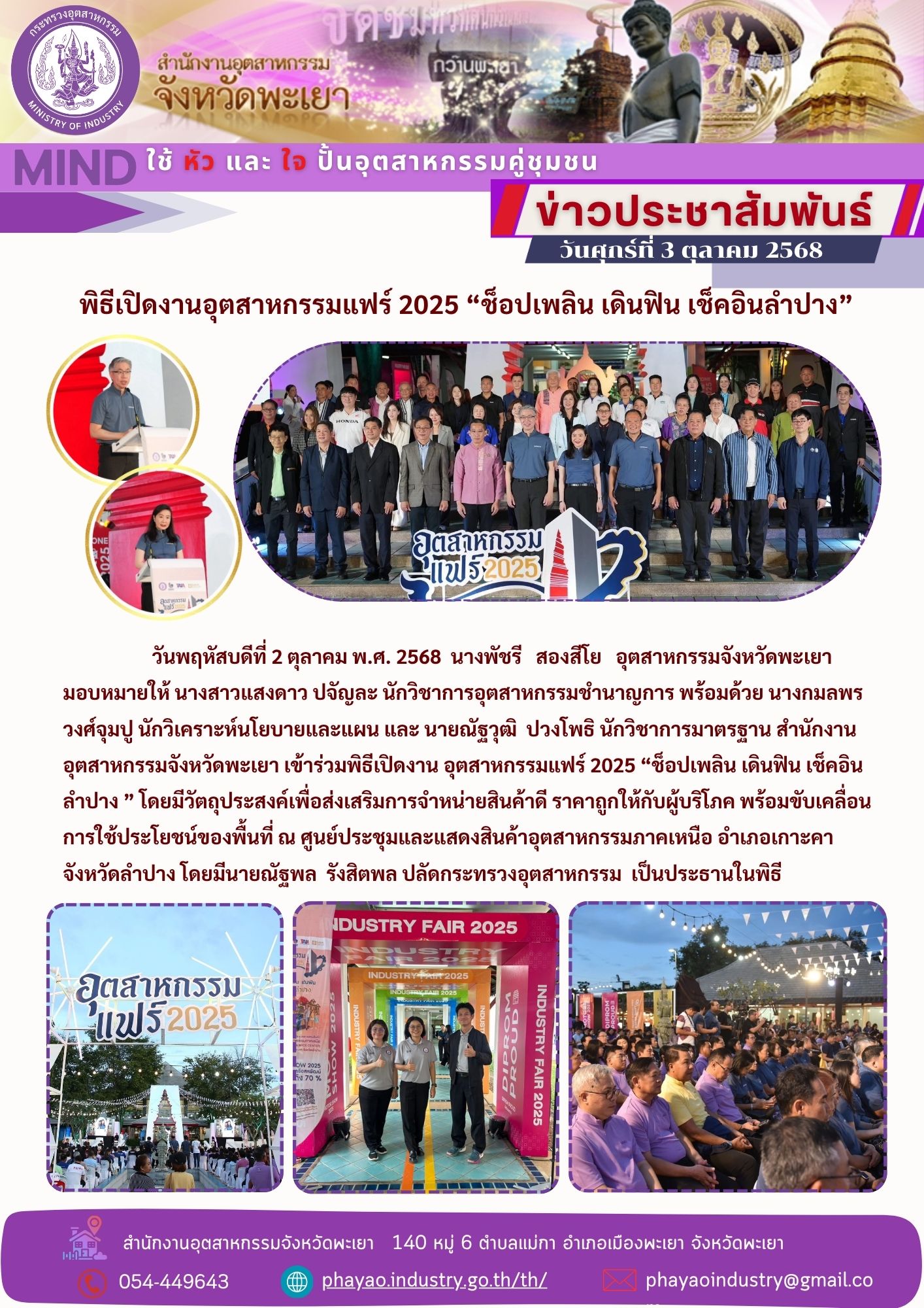 วันพฤหัสบดีที่ 2 ตุลาคม พ.ศ. 2568 นางพัชรี สองสีโย อุตสาหกรรมจังหวัดพะเยา มอบหมายให้ นางสาวแสงดาว ปจัญละ นักวิชาการอุตสาหกรรมชำนาญการ พร้อมด้วย นางกมลพร วงศ์จุมปู นักวิเคราะห์นโยบายและแผน และ นายณัฐวุฒิ ปวงโพธิ นักวิชาการมาตรฐาน สำนักงานอุตสาหกรรมจังหวัดพะเยา เข้าร่วมพิธีเปิดงาน อุตสาหกรรมแฟร์ 2025 “ช็อปเพลิน เดินฟิน เช็คอินลำปาง ” โดยมีวัตถุประสงค์เพื่อส่งเสริมการจำหน่ายสินค้าดี ราคาถูกให้กับผู้บริโภค พร้อมขับเคลื่อนการใช้ประโยชน์ของพื้นที่ ณ ศูนย์ประชุมและแสดงสินค้าอุตสาหกรรมภาคเหนือ อำเภอเกาะคา จังหวัดลำปาง โดยมีนายณัฐพล รังสิตพล ปลัดกระทรวงอุตสาหกรรม เป็นประธานในพิธี