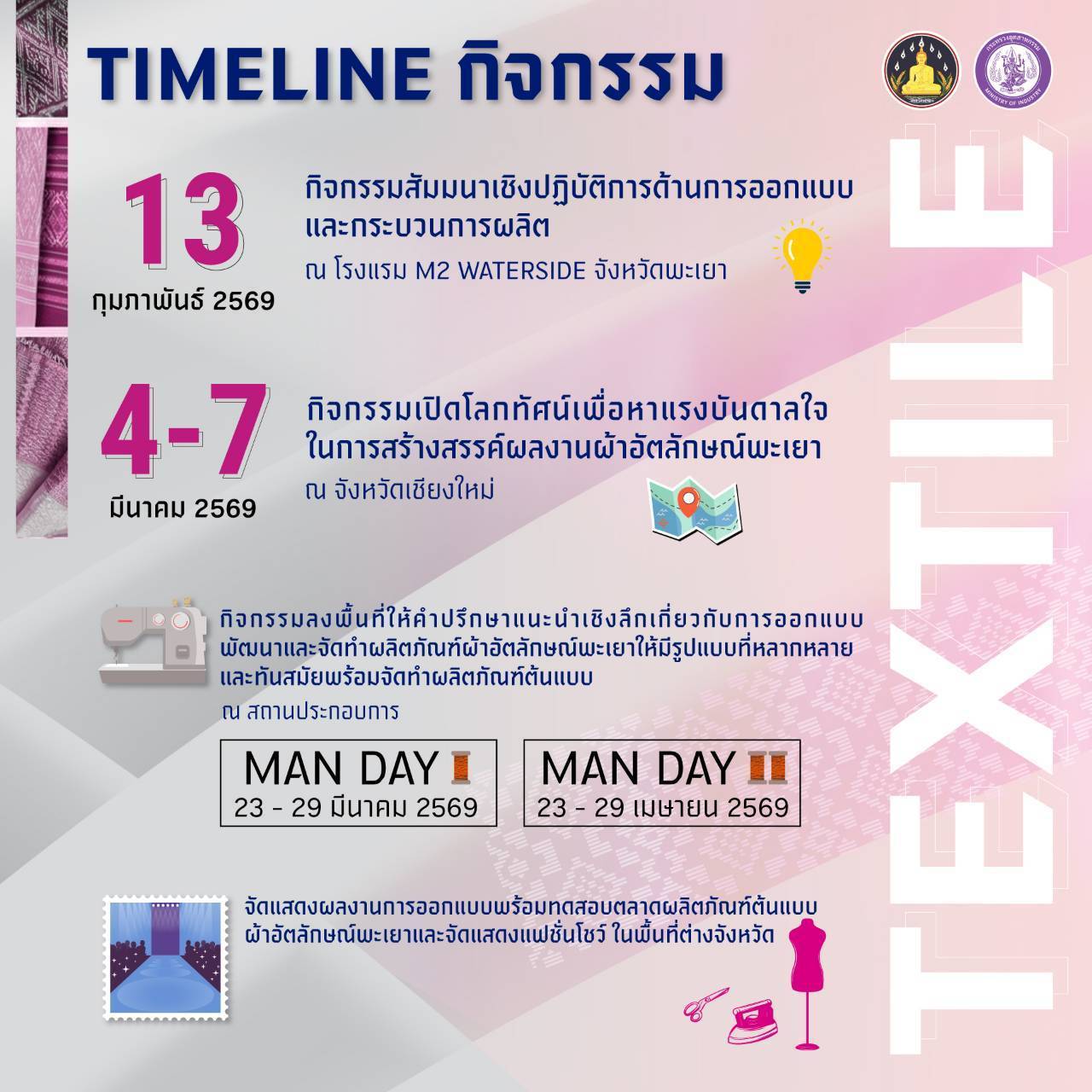 ขอเชิญผู้ประกอบการเข้าร่วมโครงการ ”แพรพรรณพะเยา” PHAYAO Textile 2026 (รับจำนวน 50 คนเท่านั้น) มาร่วมสร้างสรรค์ผ้าอัตลักษณ์พะเยาให้มีความหลากหลายและทันสมัย พร้อมก้าวสู่ตลาดระดับประเทศไปด้วยกัน กับกิจกรรมพัฒนาศักยภาพแบบครบวงจร